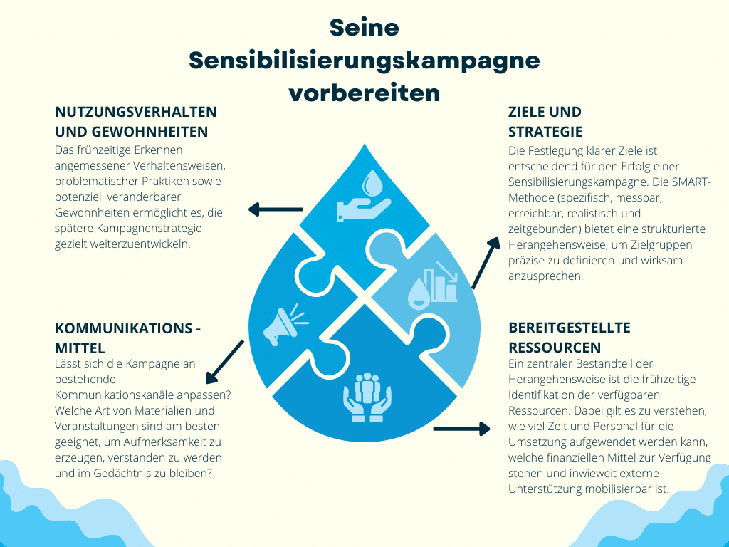 Die Ziele müssen realistisch und erreichbar sein. Indikatoren wie beispielsweise der Wasserverbrauch können in dieser Phase definiert und während der gesamten Kampagne überwacht werden, um deren Auswirkungen zu bewerten.